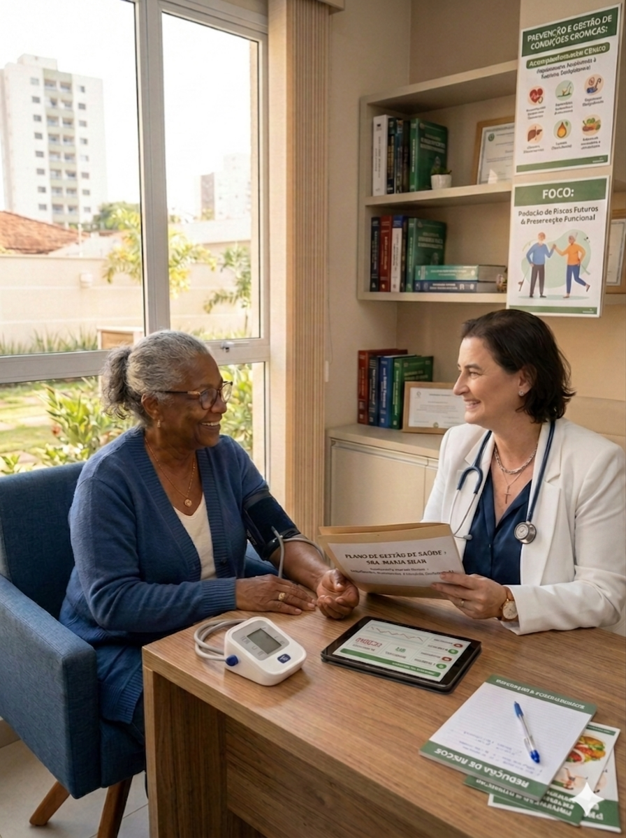 Acompanhamento clínico de hipertensão, resistência à insulina, dislipidemia e outras alterações comuns na maturidade, com foco em redução de riscos futuros e preservação funcional.