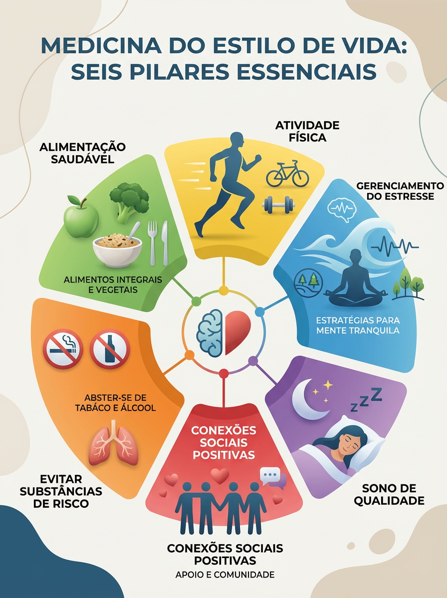 Integração prática dos pilares fundamentais da saúde — alimentação, movimento, sono, gestão do estresse e saúde emocional — com direcionamento individualizado e metas realistas.
